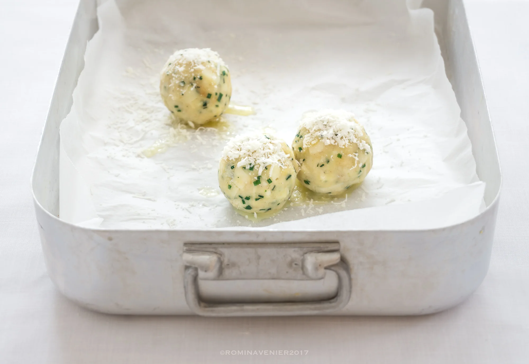 Grattate la crosta al pane raffermo (quanto ottengo io lo ripasso nel mixer e lo utilizzo come pangrattato); questo permetterà di avere un impasto molto morbido. Tagliate il pane in piccoli pezzi. Bagnatelo con il latte, mescolate e lasciare ammorbidire. Affettate finemente la cipolla e rosolatela lentamente a fuoco basso nel burro, in una casseruola dal fondo spesso, in modo che il burro non bruci. Lasciarla rosolare almeno 20min (più la cipolla si ammorbidisce nel burro, più dolce e digeribile sarà il suo gusto). Nel frattempo tagliate a dadini il formaggio (la misura di riferimento potrebbe essere il pezzo del Lego da 1); io utilizzo due tipi di formaggio: Croda Rossa o Vecia Mastela. Sono formaggi saporiti, dal forte odore se lasciati in frigo, dalla consistenza morbida che in cottura fondono ma non si disfano. Potrebbe andare bene anche un Montasio da 3/4 mesi per un gusto più delicato. Tagliuzzate finemente l'erba cipollina. A questo punto riunite tutti gli ingredienti in un contenitore capiente: pane, cipolla e burro, formaggio, erba cipollina, aggiungetevi le uova, sale e pepe, mescolare bene con un cucchiaio, aiutandovi anche con entrambe le mani. Coprite con pellicola e lasciate riposare almeno una notte in frigorifero. Il giorno successivo riprendete l'impasto, mescolate nuovamente e con le mani umide iniziare a comporre le porzioni, schiacciando bene l'impasto tra le mani e rotolandolo a formare delle palline da golf. I canederli si possono conservare in freezer avvolti separatamente nella pellicola.